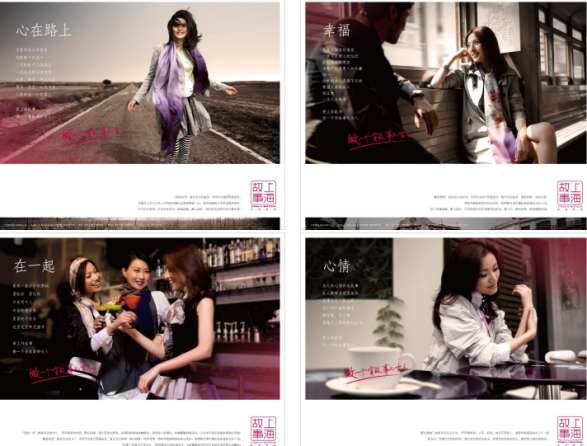 奇正提出宣传语:上海故事,阐述都市女生的生活故事,封面女性都带着一条围巾,加固品牌绑定。